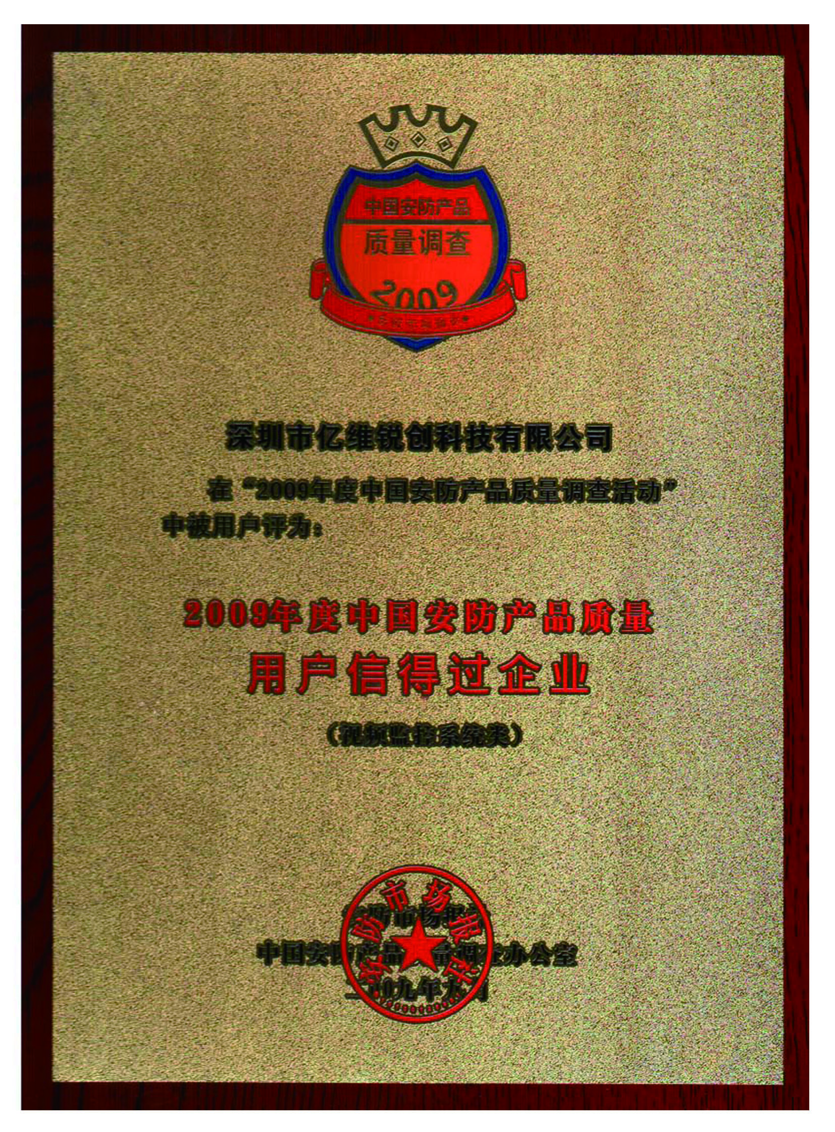 在剛剛結(jié)束的由中國安防市場舉辦的中國安防產(chǎn)品質(zhì)量評比中,深圳億維銳創(chuàng)憑借過硬的產(chǎn)品質(zhì)量和廣泛的用戶支持脫穎而出,榮獲視頻監(jiān)控系統(tǒng)類“2009年度中國安防產(chǎn)品質(zhì)量用戶信得過企業(yè)”獎(jiǎng)。