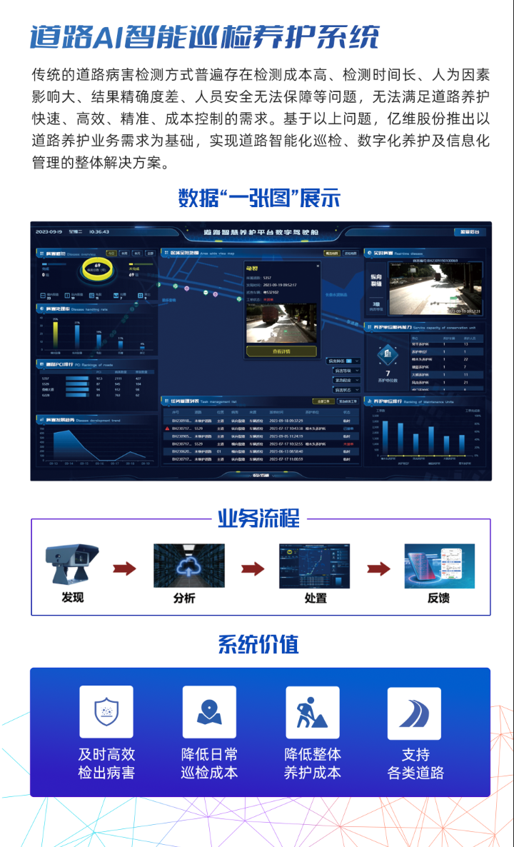 道路AI智能巡檢養(yǎng)護系統(tǒng)是可實現(xiàn)道路智能化巡檢、數(shù)字化養(yǎng)護及信息化管理的整體解決方案。該系統(tǒng)通過利用人工智能技術(shù),實現(xiàn)了道路巡檢、病害檢測、應(yīng)急處置等養(yǎng)護工作的智能化、自動化,降低了道路養(yǎng)護成本,提高了道路使用壽命。